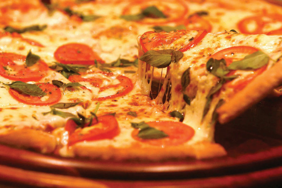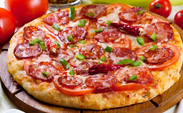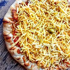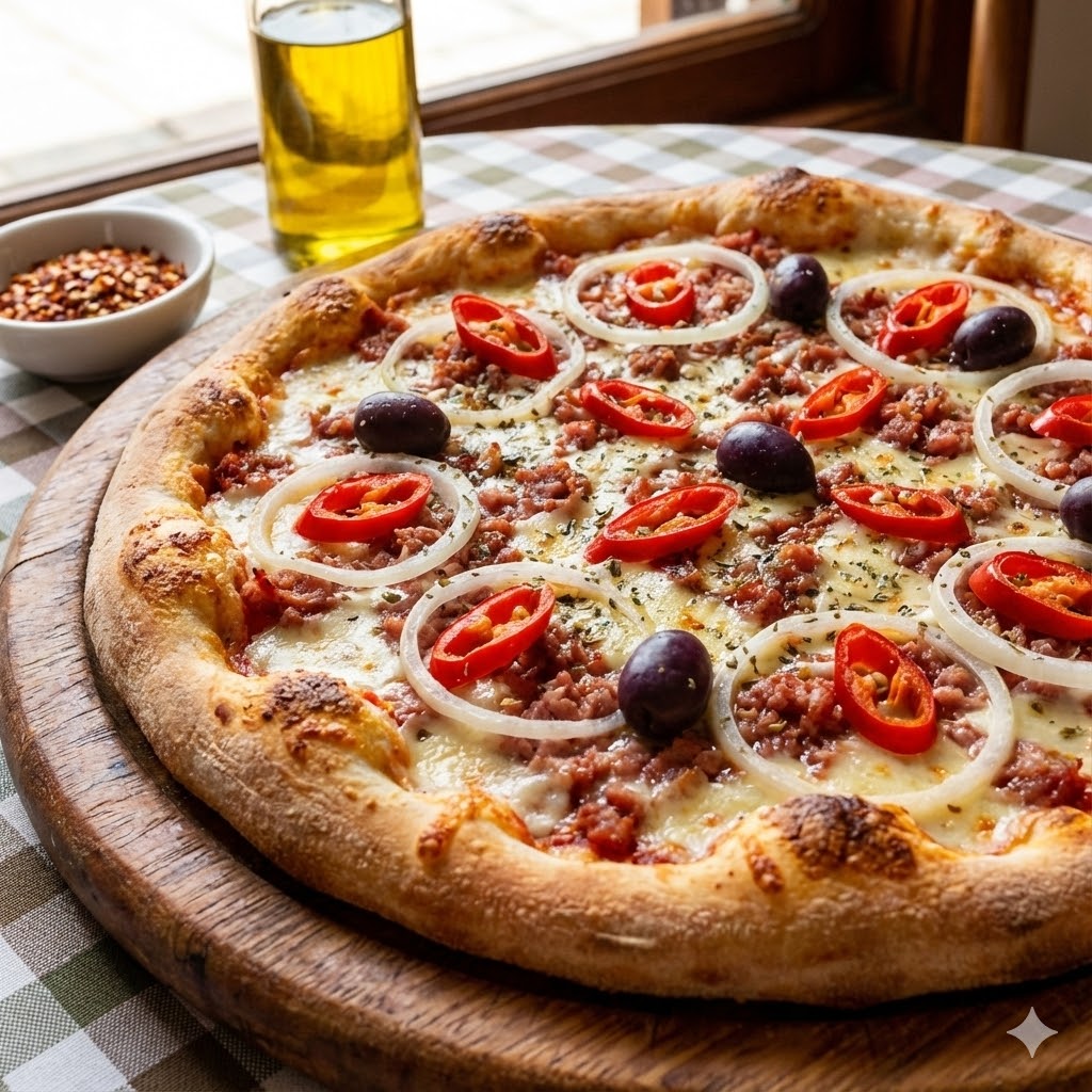 Pizza BaianaMolho de tomate, Mussarela, Calabresa triturada, Pimenta, Cebola, Azeitona e Orégano.